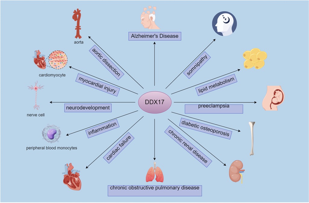 Figure 3. DDX17-Associated pathophysiological roles and target cells/tissues.DDX17 connects to conditions like Alzheimer's disease, aortic dissection, and chronic renal disease, alongside target cells/tissues such as cardiomyocytes, nerve cells, and the aorta.It links to neurological (Alzheimer's, neurodevelopment), cardiovascular (aortic dissection, myocardial injury), and metabolic/renal (lipid metabolism, chronic renal disease) pathways, via cells like nerve cells and peripheral blood monocytes.