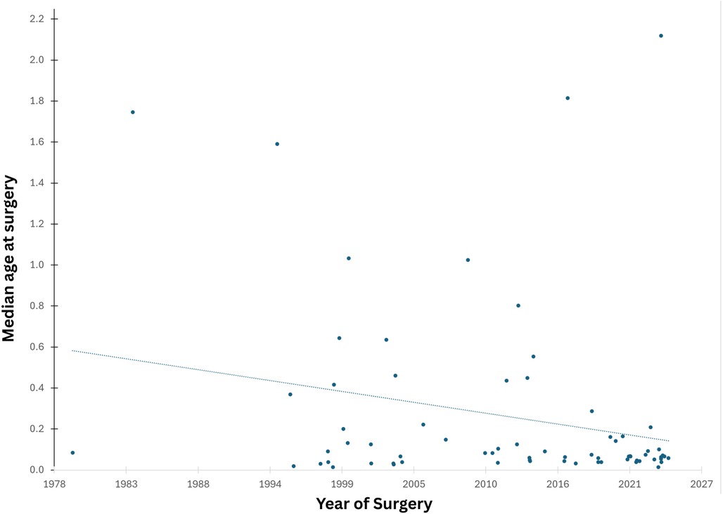 Age at surgery declined significantly over time from ∼6 months in the early 2000s to ∼1 month in recent years. The current median age at surgery is 27 days (Figure 1).