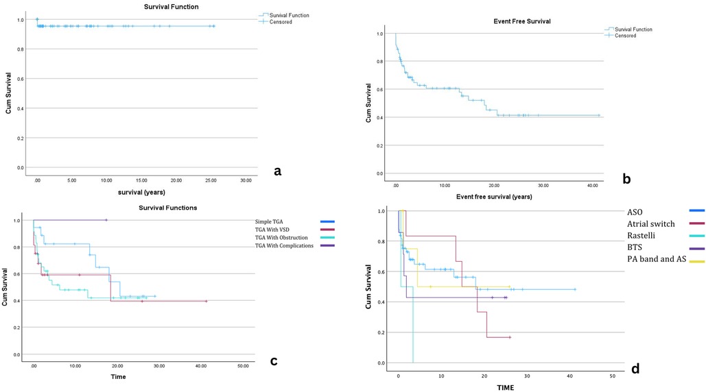 Figure 2. Kaplan–Meier survival analyses for patients with dextro-transposition of the great arteries (d-TGA). Panel (a) Overall survival following diagnosis. Panel (b) Event-free survival (EFS) for all patients after surgical repair. Panel (c) EFS stratified by surgical procedure (arterial switch operation, atrial switch, Rastelli). Panel (d) EFS stratified by diagnostic subtype (simple d-TGA, d-TGA with VSD, d-TGA with LVOTO). Censored observations are indicated by “+”.