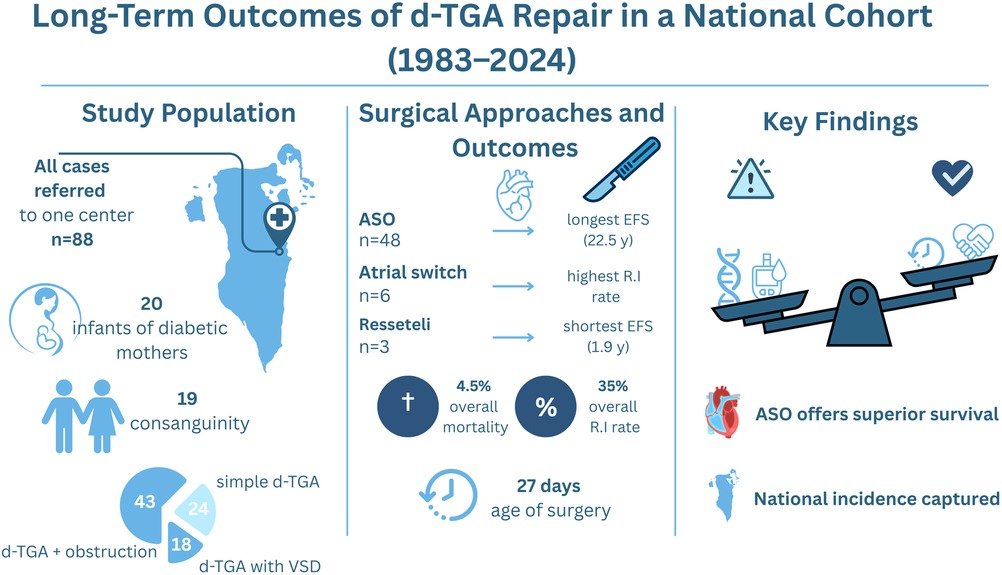 Figure 3. Central illustration—long-term outcomes of d-TGA repair in a national cohort (1983–2024). Left panel: Cohort demographics, including 88 patients referred to a single center, 20 infants of diabetic mothers, and 19 from consanguineous families. Middle panel: Event-free survival by procedure, with arterial switch operation (ASO) showing the longest durability (22.5 years) compared with atrial switch and Rastelli procedures. Overall mortality was 4.5%, and the reintervention rate was 35%. The median age at surgery declined to 27 days in recent decades. Right panel: Balance of risk and protective factors influencing outcomes, emphasizing ASO as the superior surgical strategy.