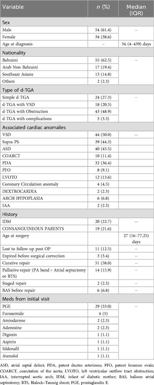 A total of 88 patients with d-TGA met the inclusion criteria between 1983 and 2025. Most were Bahraini (55%), followed by Arab non-Bahraini (31%) and South Asians (13%). The cohort had a male-to-female ratio of 1.6:1. The most common associated anomaly was d-TGA with VSD. 20 patients were born to diabetic mothers, and 19 to consanguineous parents. Additional characteristics are presented in Table 1.