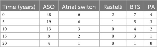 In the ASO era, in-hospital mortality is exceptionally low, with a 20-year survival rate approaching >97% (9). Long-term outcomes are excellent, with 93% survival at 35 years. This contrasts with a 64% survival at 40 years reported in a meta-analysis of d-TGA patients treated with atrial switch correction (10, 11).