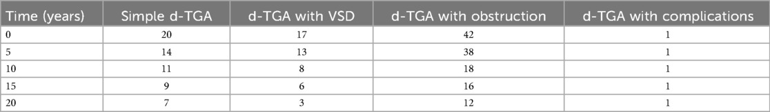 The median follow-up duration was 4.3 years, consistent with other studies (34). A significant portion of patients are non-Bahraini and return to their home countries, complicating long-term follow-up. Historical resource limitations necessitated overseas referrals, further impacting follow-up. The establishment of a tertiary cardiac center has alleviated this issue. Despite these challenges, event-free survival aligns with existing literature, with simple d-TGA showing the highest rates (29).