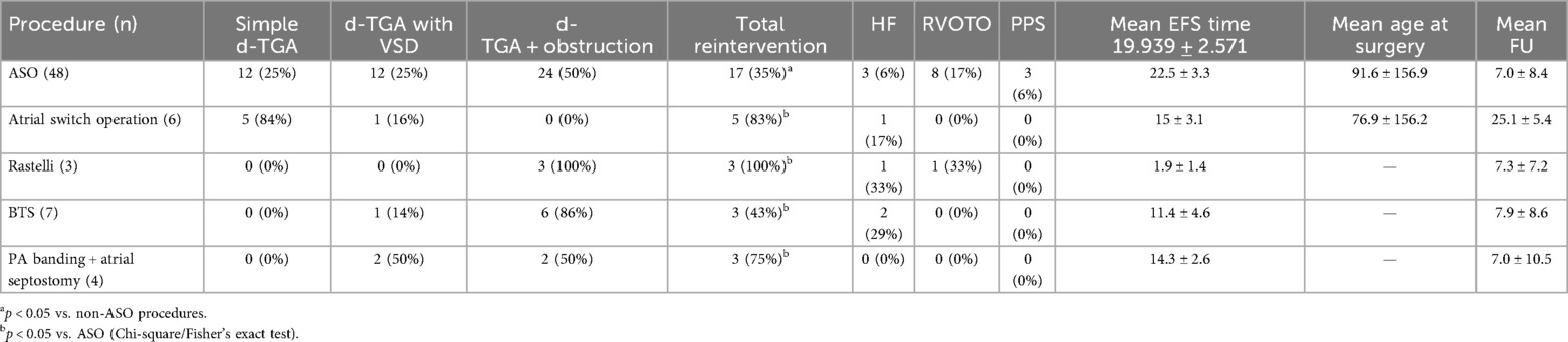 Atrial switch (n = 6) was mostly used for simple d-TGA (84%), with a high reintervention rate (83%) and lower mean EFS of 15 ± 3.1 years. The Rastelli procedure (n = 3), used exclusively for d-TGA with outflow tract obstruction, had a 100% reintervention rate and the shortest mean EFS (1.9 ± 1.4 years).