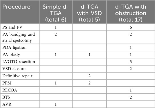Surgical repairs were performed in line with accepted international norms. Patients with simple d-TGA who presented early were managed with an arterial switch operation (ASO), including coronary artery transfer, the LeCompte maneuver, and closure of associated shunts such as VSDs or PDAs when required. Complex d-TGA with left ventricular outflow tract obstruction (LVOTO) was treated with the Rastelli procedure, while patients with significant systemic outflow hypoplasia underwent a Damus–Kaye–Stansel (DKS) anastomosis. Atrial switch procedures (Senning/Mustard) were reserved for late presenters with regressed left ventricles, where ASO was no longer feasible. In selected high-risk neonates.