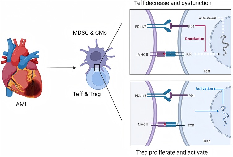 Figure 1. Role of the PD-1/PD-L1 pathway in regulating T-cell immunity during AMI. This figure is created with BioRender.com.