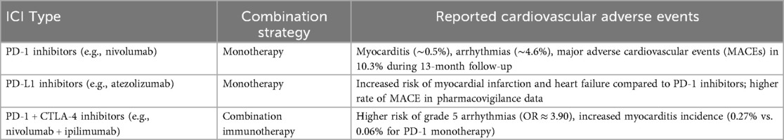 The introduction of ICIs, especially those targeting PD-1 and PD-L1, has transformed cancer treatment but has also brought attention to their potential cardiovascular toxicities. Reports from clinical studies and observational cohorts have identified a spectrum of cardiovascular adverse events (CVAEs), including myocarditis, heart failure, arrhythmias, and acute myocardial infarction, with varying frequencies (Table 1). A systematic review and meta-analysis estimated the incidence of myocarditis in ICI-treated patients to be about 0.5% (40), while arrhythmias were observed more frequently, occurring in roughly 4.6% of cases (40). In addition, evidence from a cohort study showed that 10.3% of patients developed major adverse cardiovascular events (MACEs) during a median follow-up of 13 months, underscoring the importance of close cardiovascular surveillance in individuals receiving ICIs (41). Chemotherapy increases the risk of cardiovascular events (myocarditis, MI, arrhythmias) when combined with ICIs, possibly via PD-1/PD-L1 pathway modulation.