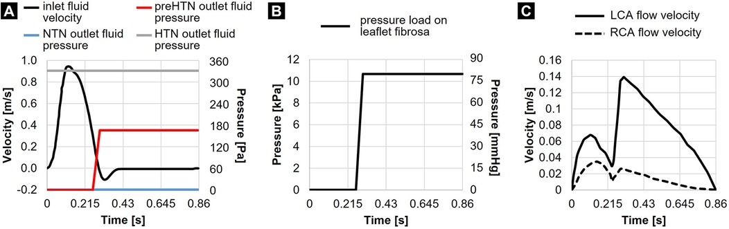 Figure 2. Flow and structural boundary conditions: (A) inlet fluid velocity and outlet fluid pressures prescribed in the NTN, preHTN, and HTN models; (B) pressure load prescribed on the leaflet fibrosa in all models; and (C) coronary flow velocities.