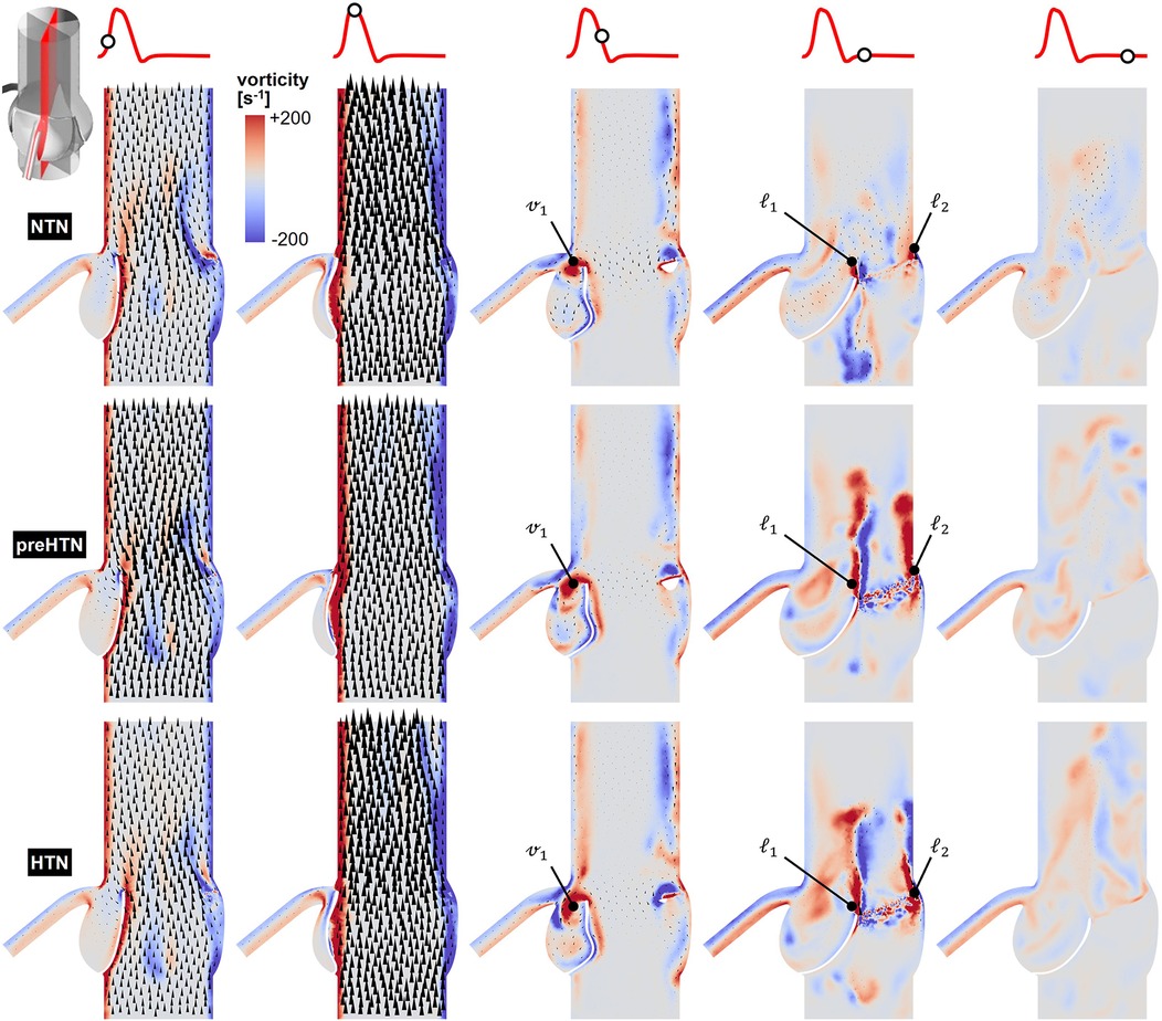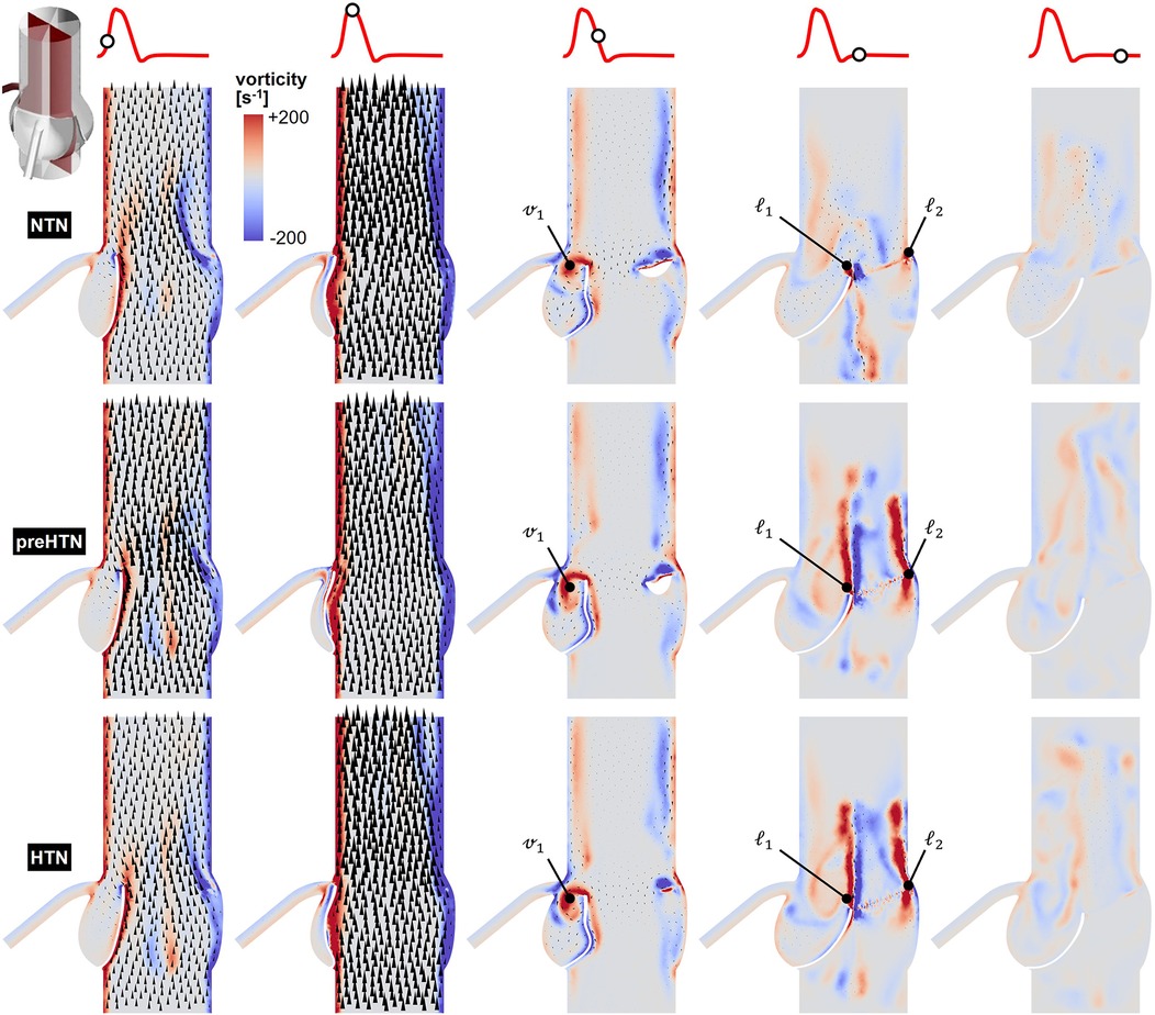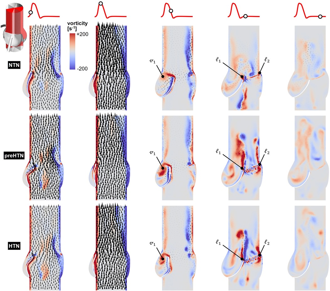 Systolic hemodynamics was weakly impacted by the pressure condition (<8% difference in in-plane vorticity between NTN, preHTN and HTN). All models resulted in similar flow patterns exhibiting jet-like characteristics including the existence of a unidirectional and streamlined flow, and the presence of shear layers extending from the leaflet tips. As expected, vorticity was mainly concentrated along the aortic and leaflet walls as well as in the shear layers, where velocity gradients are particularly high. During the deceleration phase, the flow was also relatively consistent across all models but exhibited more complex flow features. The interactions between the valvular jet, the near-stagnant sinus flow and the moving leaflets generated vortices near the leaflet tips (feature ℓ1), which rolled up and migrated toward the sinus wall. The size and penetration distance of those vortices into the sinuses increased in a pressure-dependent manner.