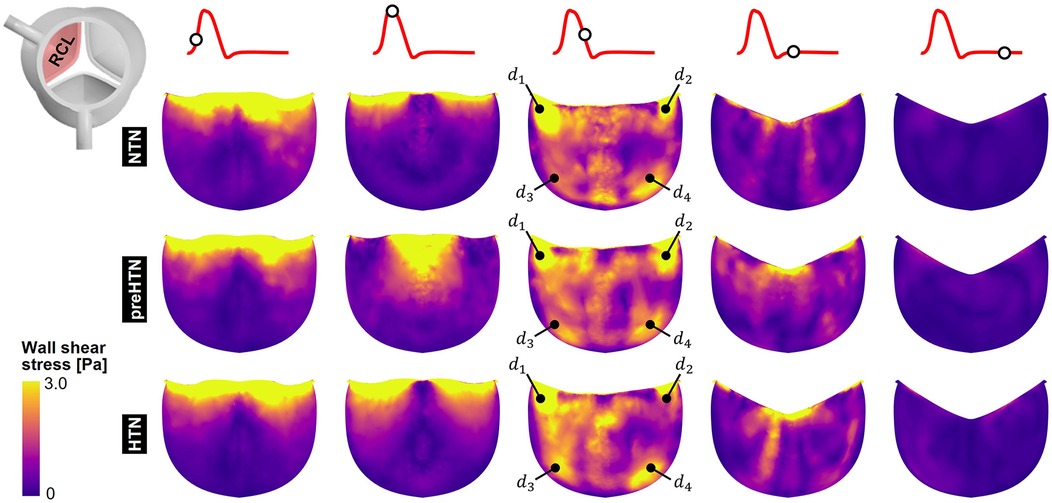 Figure 7. Snapshots of the fluid wall shear stress (fWSS) contours captured on the fibrosa of the RCL in the NTN, preHTN and HTN models during the acceleration phase (t = 0.08 s), peak systole (t = 0.13 s), the deceleration phase (t = 0.27), early diastole (t = 0.40 s), and late diastole (t = 0.56 s).