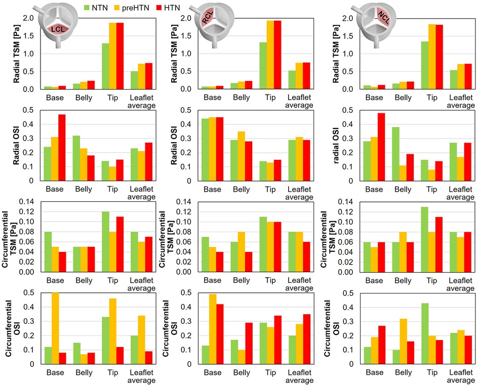 Results: Hypertensive conditions increased early diastolic flow vorticity and decreased the leaflet coaptation angle in a pressure-dependent manner. PreHTN and HTN subjected all leaflets to fWSS overloads (up to 45% increase in radial TSM vs. NTN). While preHTN and HTN resulted in contrasted radial TSM alterations in the leaflet base (up to 0.6- and 1.3-fold change, respectively, vs. NTN), both conditions caused an increase in radial TSM in the belly and tip regions (up to 1.5-fold increase vs. NTN). Radial fWSS bidirectionality increased in a pressure-dependent manner in the base of the left- and non-coronary leaflets (up to 0.23-point increase in OSI vs. NTN) but was attenuated in the belly region (up to 0.19-point decrease). Hypertension caused a pressure-dependent increase in tS ratio (up to 5% increase vs. NTN) on the left- and non-coronary leaflets.