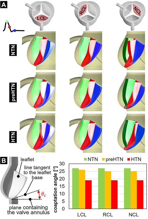 Figure 10. Leaflet deformation characteristics: (A) leaflet profiles captured at peak systole (green), during the deceleration phase (red) and during diastole (blue); and (B) leaflet coaptation angle predicted in the NTN, preHTN and HTN models.