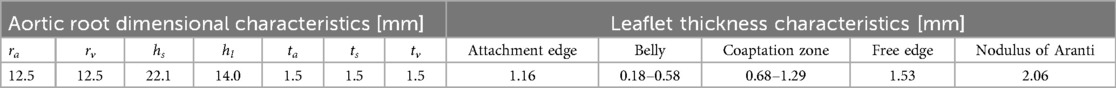 The aortic root geometry previously designed and published by our group (26) served as the foundation for the model developed in the present study. Briefly, the aortic root included the AV leaflets, the aortic sinuses and the two coronary ostia. The aortic root was reconstructed parametrically using published human dimensions for key anatomical features (left-ventricular outflow tract and aortic diameters, aortic wall thickness, sinus height and diameter, leaflet height, Table 1) (27, 28). The AV leaflet geometry was generated by considering different anatomical landmarks (e.g., tip point, centerline, commissure point, annulus points) and the native leaflet regional thickness (29) (Figure 1A). Three identical leaflets were created using this approach and placed within the aortic root geometry to model the left-coronary leaflet (LCL), right-coronary leaflet (RCL) and non-coronary leaflet (NCL) in a nearly closed position (Figure 1B). Coronary ostia were placed 18 mm above the aortic annulus (30), and the left- and right-coronary arteries (LCA and RCA, respectively) were modeled as circular conduits [LCA diameter: 4.0 mm; RCA diameter: 3.2 mm (30, 31)] extending 20 mm away from the aortic wall. The aortic outlet was also modeled as a circular conduit extending 36 mm from the sinotubular junction to improve flow development and numerical stability (Figure 1C).