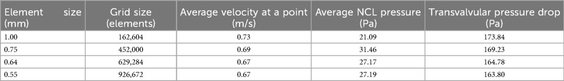 The structural and fluid domains were spatially discretized using tetrahedral elements. The structural grid consisted of 48,516 tetrahedral elements (element size: 0.57 mm), which was determined from a previous mesh sensitivity analysis performed on a similar valve geometry (40, 41). For the fluid domain, a mesh sensitivity analysis was performed to determine the appropriate element size. Briefly, the fluid domain was first discretized using an element size of 1.0 mm. FSI simulations were run until peak systole. The geometry of the fluid domain was captured at that time with the valve in its fully open state, and meshed using four different element sizes (1.0, 0.75, 0.64 and 0.55 mm). Steady-state computational fluid dynamics (CFD) simulations representative of peak-systolic conditions (flow rate: 25 L/min) were then performed to quantify the effect of mesh element size on the flow velocity at a point located 21 mm downstream of the inlet, the pressure drop across the model, and the surface-averaged pressure on the NCL. The results indicated that the smallest element size generated less than 1% change in each parameter as compared to the previous grid size (Table 2). Therefore, an element size of 0.64 mm, which resulted in a computational grid of 629,284 elements, was adopted to mesh the fluid domain of all FSI models. While the mesh sensitivity analysis was performed at peak systole, its validity is expected to extend throughout the cardiac cycle due to the dynamic remeshing method that was selected to maintain the initial mesh size distribution during mesh motion. By controlling local refinement, limiting skewness and preserving original element sizing, this remeshing method ensured the maintenance of a consistent mesh quality throughout the cardiac cycle even as elements are added or removed.