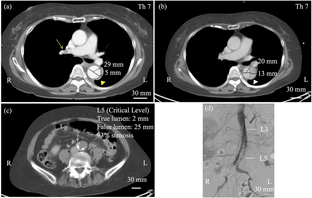 On day 12, the patient experienced sudden, severe bilateral leg pain. Femoral pulses were absent bilaterally, while abdominal examination remained unremarkable. Laboratory tests at the time of limb ischemia showed lactate 1.9 mmol/L, CK 1,466 U/L, creatinine 1.19 mg/dL, and urine output 20 mL/h. Lower limb blood pressure was unmeasurable, and Rutherford grade was IIb. Emergency CT demonstrated progression to a patent false lumen (Figure 1b) with the primary entry at the level of Th11, and significant narrowing of the true lumen below the renal arteries, resulting in acute malperfusion of the abdominal aorta and lower extremities (Figure 1c). Digital subtraction angiography confirmed severe stenosis of the infrarenal true lumen (critical levels at L5, 93% stenosis), while major visceral branches remained patent (Figure 1d).