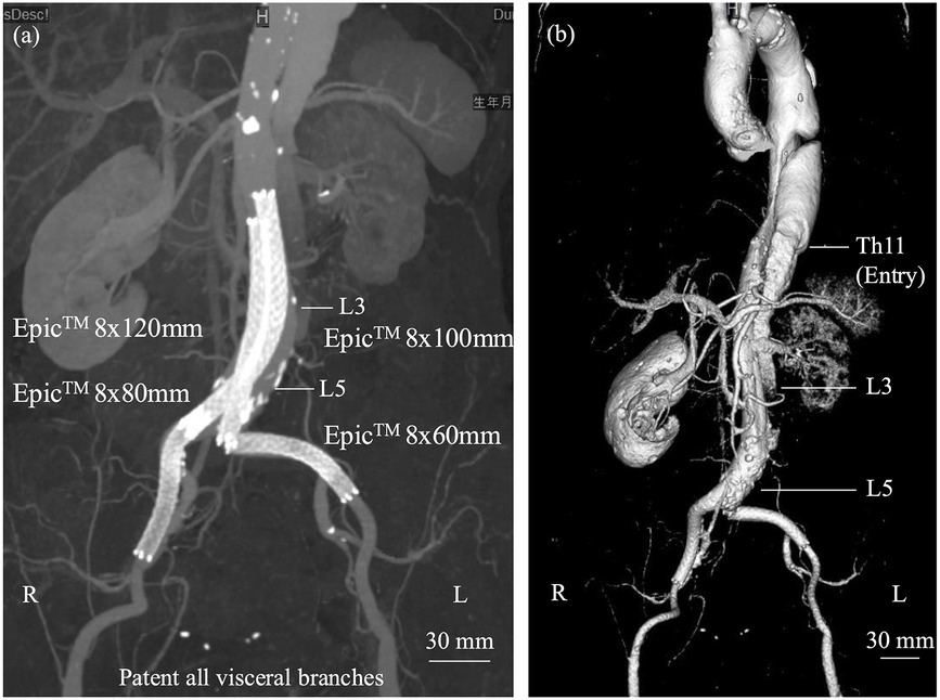 Figure 2. (a) Two self-expanding stents were deployed in a kissing configuration within the abdominal aorta, each extending into the respective iliac artery and relined with additional stents. (b) Post-discharge computed tomography demonstrated preservation of the true lumen from the abdominal aorta, distal to the renal arteries, to the external iliac arteries, although the left renal artery showed reduced flow without complete occlusion.