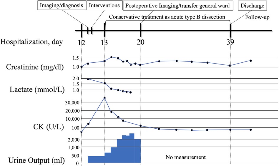 Figure 3. Clinical timeline from symptom onset to follow-up. The timeline begins with symptom onset of acute bilateral lower limb ischemia with relevant laboratory abnormalities (e.g., lactate, creatine kinase, creatinine, urine output), emergency deployment of bridging bare-metal stents, restoration of limb perfusion, and follow-up.