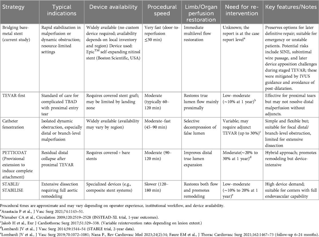 The optimal treatment strategy for acute TBAD complicated by visceral ischemia remains case-dependent, as no standardized regimen has been established. In particular, patients with visceral or lower limb malperfusion face increased rates of mortality and postoperative complications, even following successful aortic replacement, due to ischemia–reperfusion injury in previously underperfused organs and the systemic effects of accumulated metabolic byproducts (3). In the setting of organ malperfusion, endovascular intervention is currently considered the first-line treatment, with thoracic endovascular aortic repair (TEVAR) specifically recommended (1, 4). Extra-anatomic bypass from the axillary artery to the bilateral femoral arteries is another emergency option, particularly in cases of lower extremity malperfusion. However, when ischemia extends to the abdominal organs, the efficacy of this approach becomes uncertain. Consequently, it is generally not regarded as the first-line treatment, with reported mortality and morbidity rates of 5% and 31.6%, respectively (5). While such emergency life-saving interventions are selected based on the patient's clinical condition, even technically successful procedures are associated with a reported mortality rate of 14%, indicating the need for further therapeutic refinement (5). The bridging bare-metal stent technique provides rapid, resource-constrained restoration of multilevel dynamic flow in acute malperfusion while preserving the option for staged, definitive repair (e.g., TEVAR). This approach is particularly valuable in emergent situations or in institutions without immediate access to covered stent grafts (Table 1).