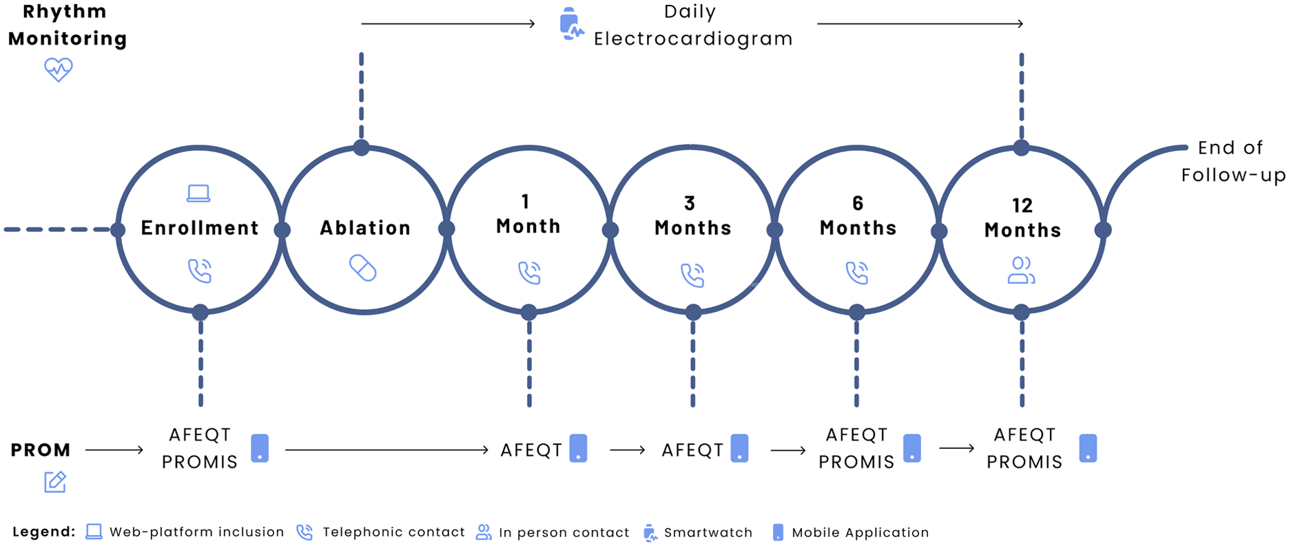 Study design. Adapted from “Digital follow-up workflow. AFEQT = Atrial Fibrillation Effect on Quality-of-Life; ECG = electrocardiogram; PROM = patient-reported outcome measure; PROMIS = Patient-Reported Outcomes Measurement Information System” by João G. Almeida, Rafael Teixeira, Inês Neves, Mafalda Carrington, Paulo Fonseca, Marco Oliveira, Helena Gonçalves, João Primo, Ricardo Fontes-Carvalho, Sérgio Barra, Juan Pablo Martínez, and Rute Almeida, licensed under CC BY-NC-ND.