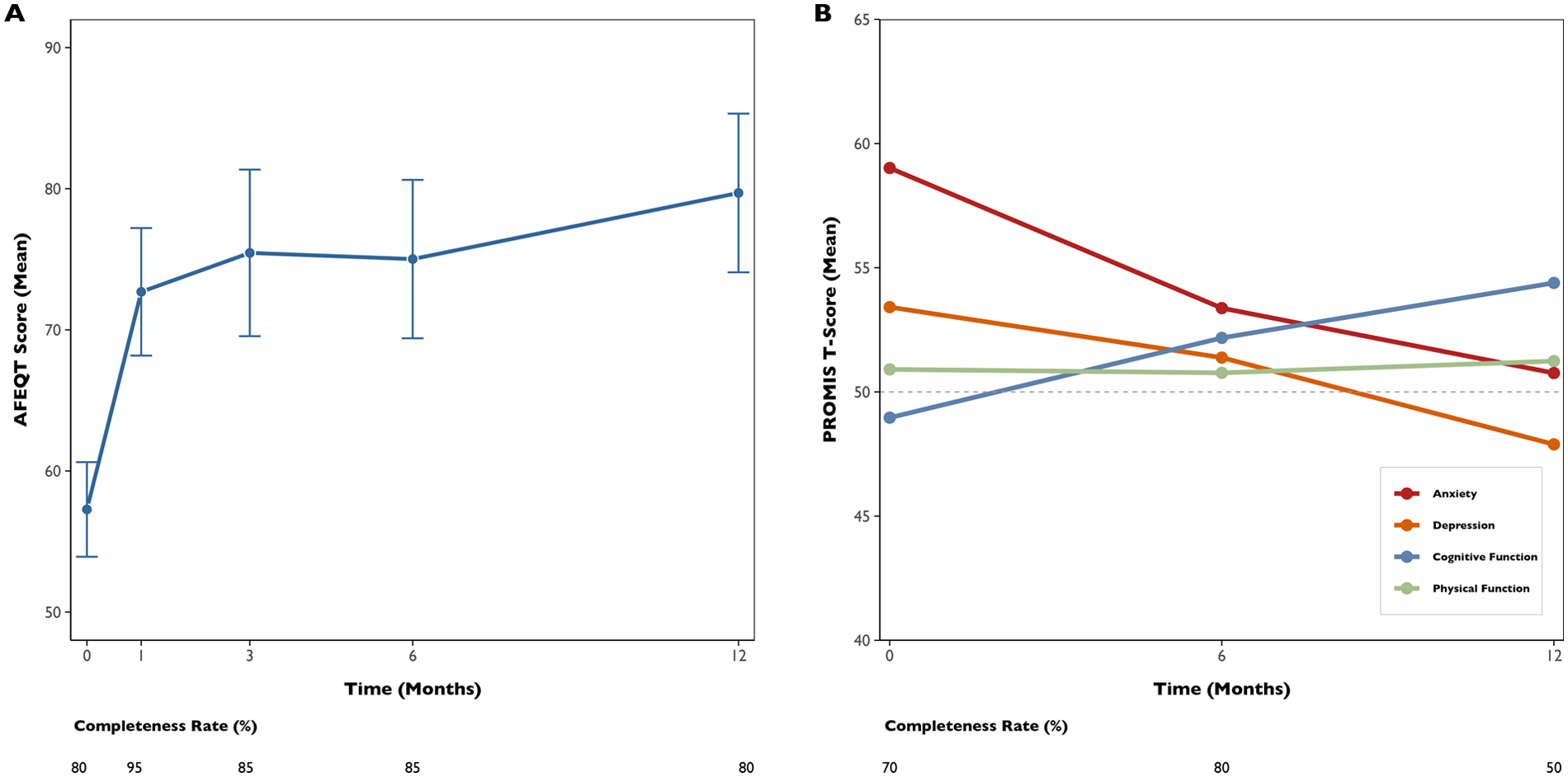 Trends in quality-of-life scores over 12 months following ablation. AFEQT mean score, with error bars, in the 12 months after ablation [left panel, (A)]. PROMIS mean T-Scores of the four domain questionnaires in the 12 months after ablation [right panel, (B)]. The round points represent specific time points of health-related questionnaire assessment.