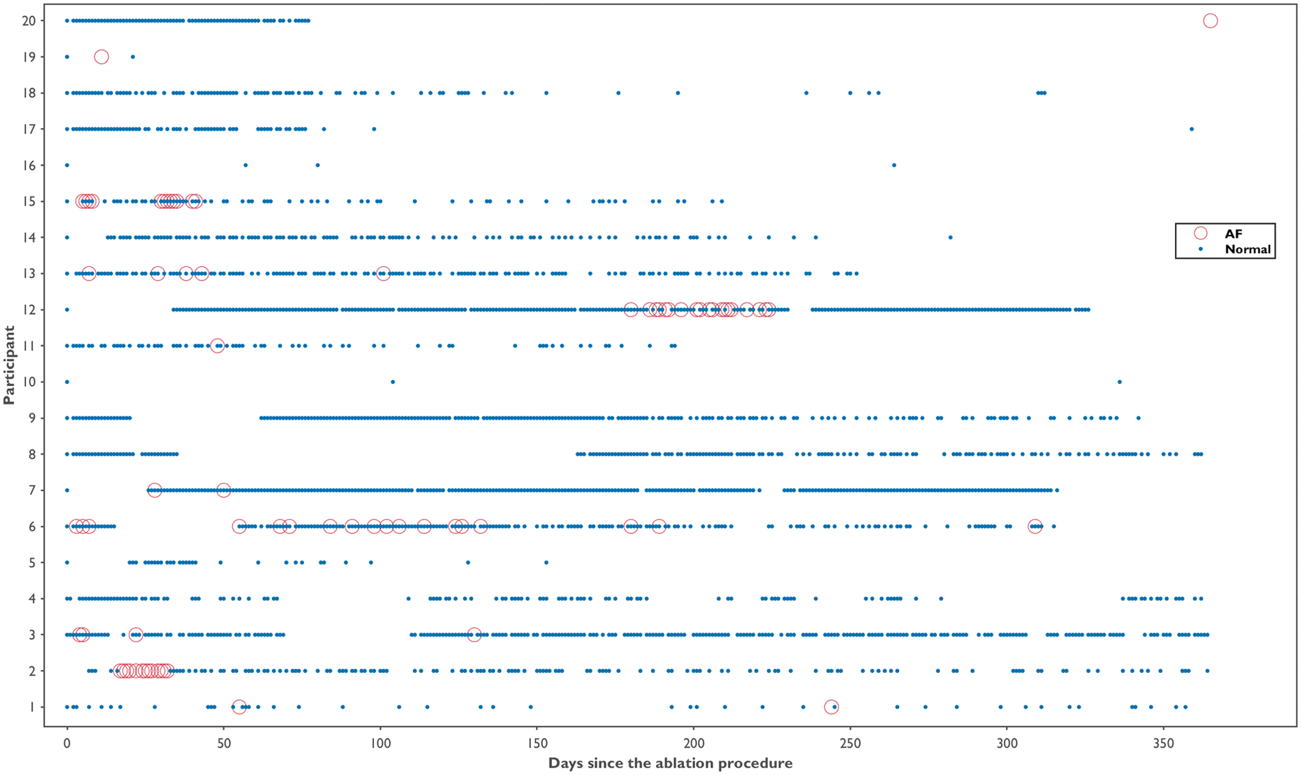 Temporal distribution of smartwatch ECG recordings by participant over 12 months post-ablation. Each blue dot represents a normal ECG recording; red circles indicate ECGs classified as atrial fibrillation. Gaps indicate days without ECG recordings.