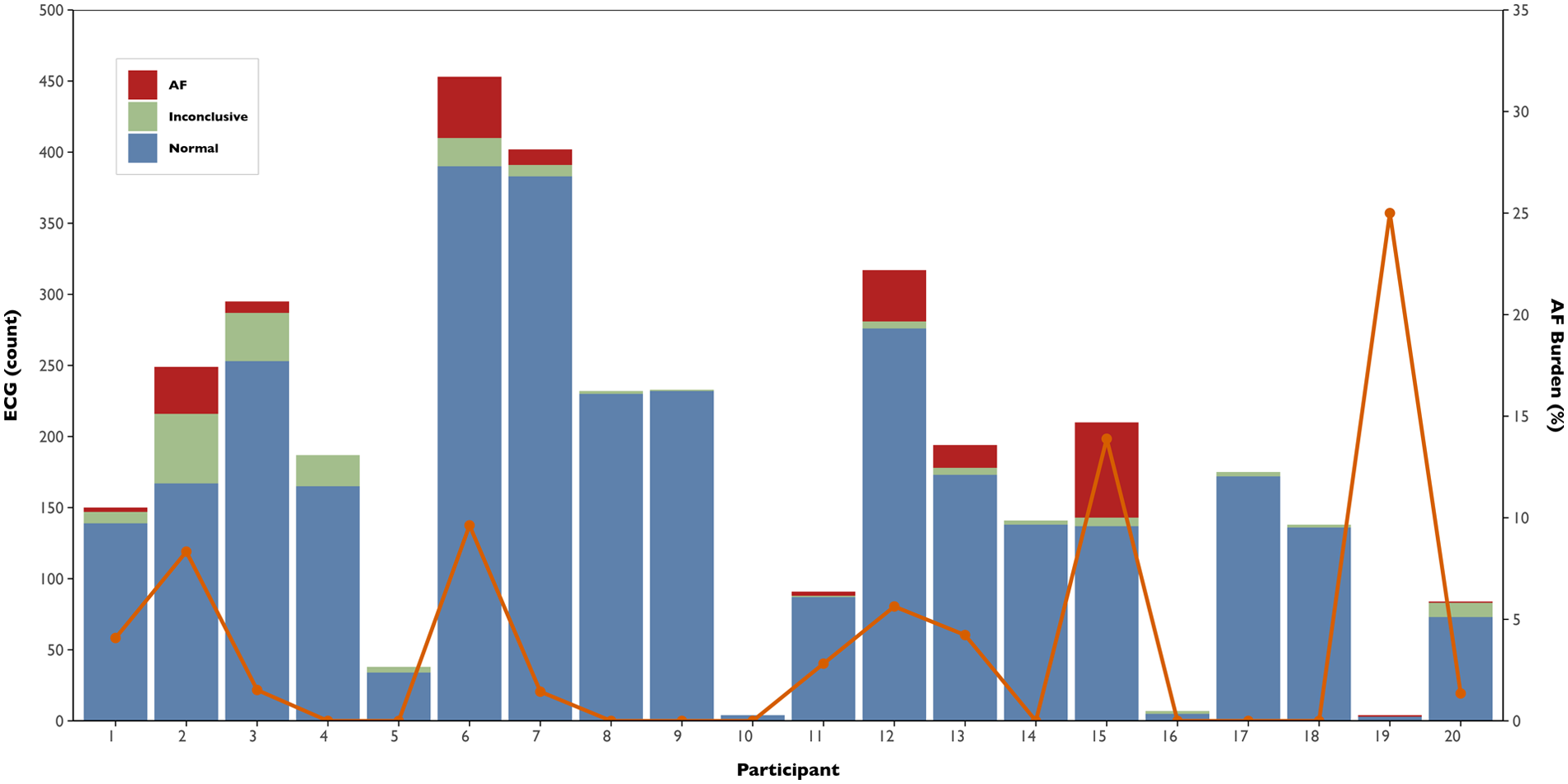 Atrial fibrillation burden and electrocardiogram classification by participant. Stacked bars represent the total number of smartwatch ECGs recorded per participant, classified as normal (blue), inconclusive (green), or AF (red). The orange line indicates the corresponding AF burden, defined as the percentage of monitored days with at least one AF-detected ECG.