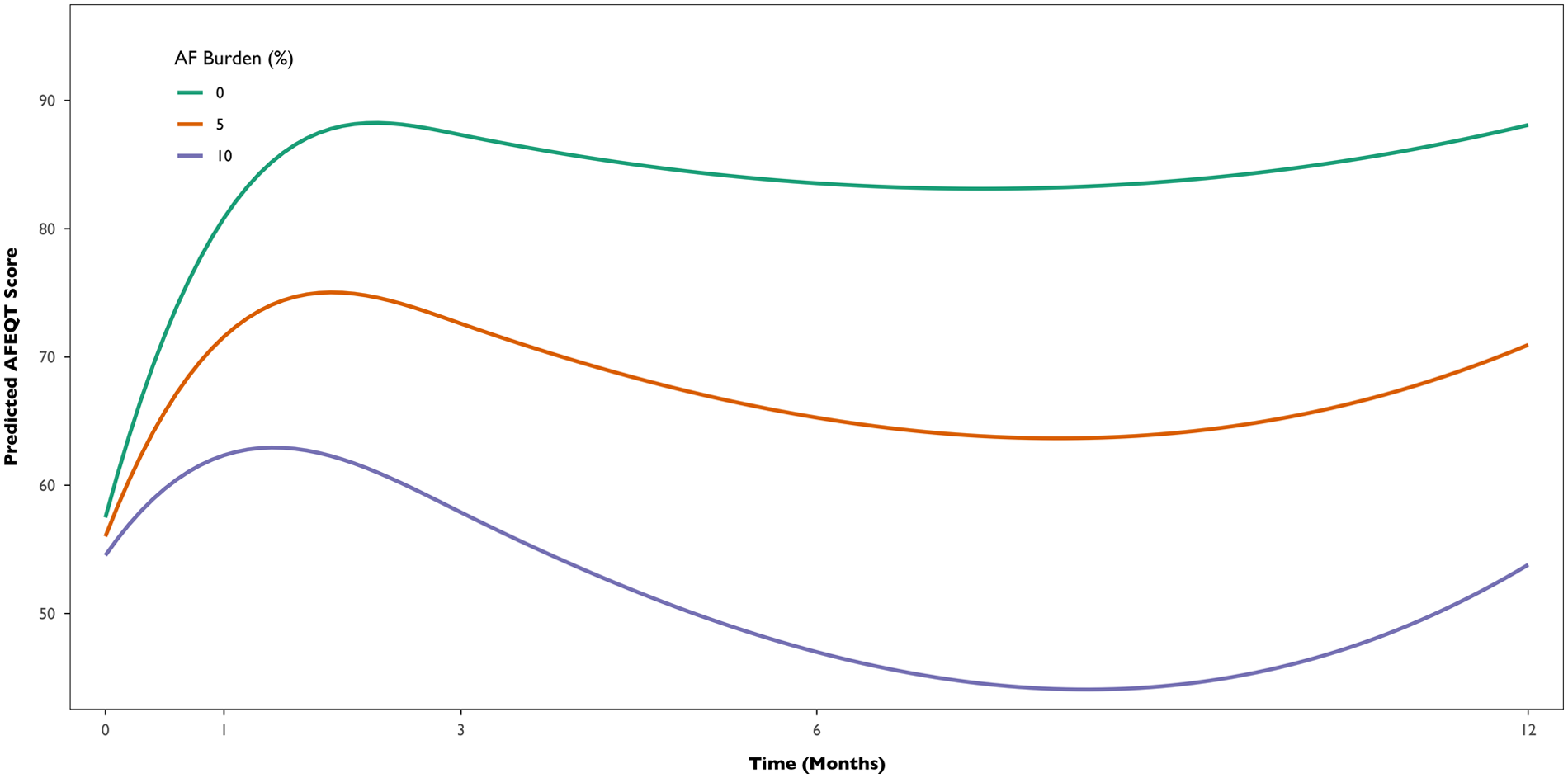 Predicted AFEQT score trajectories over 12 months by AF burden level (0%, 5%, and 10%). Model-based estimates derived from the Bayesian multilevel analysis with flexible time trajectories (splines), adjusted for CHA₂DS₂-VASc score, baseline AFEQT, AF type, and left atrial volume.