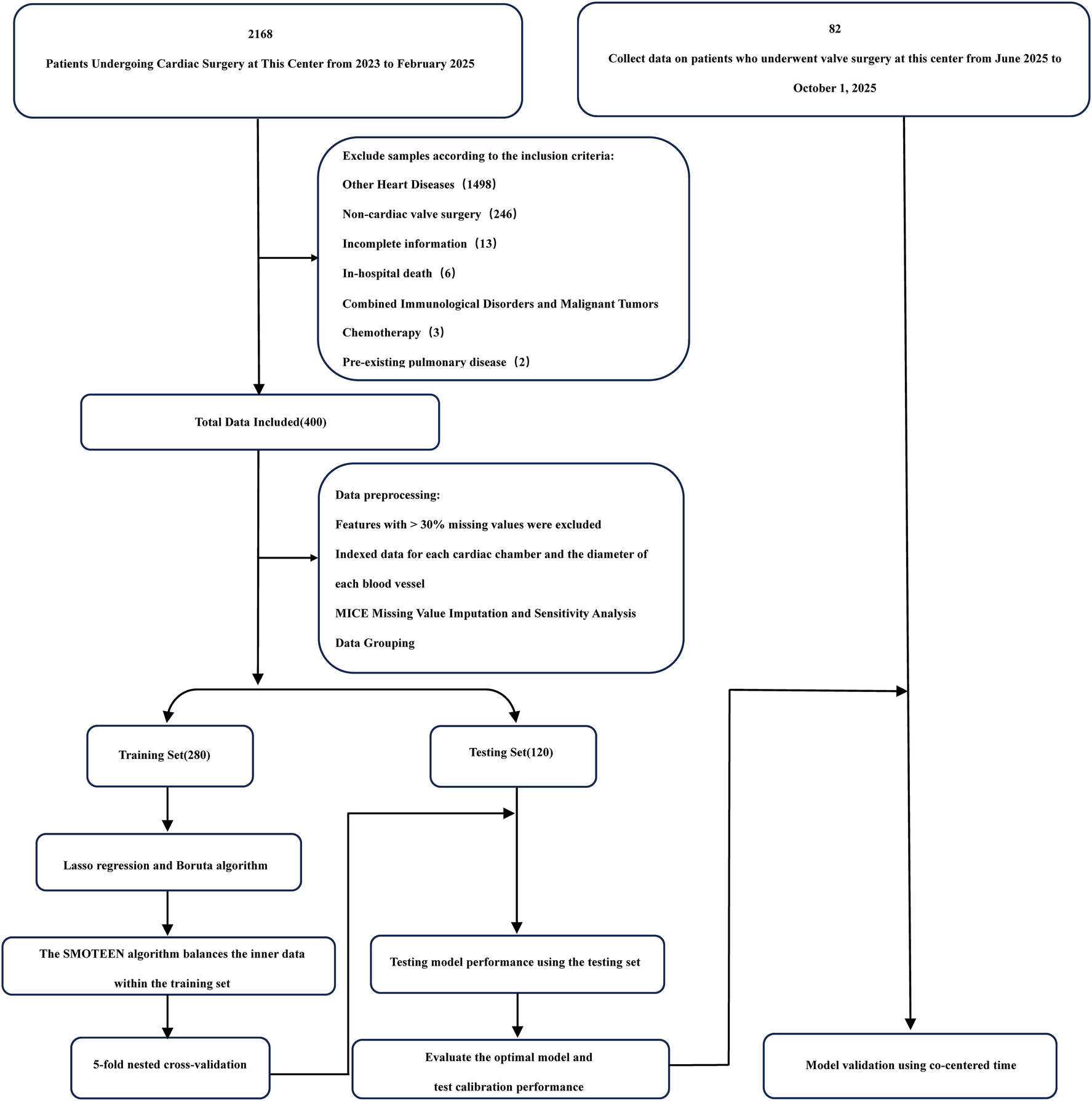 We retrospectively analyzed 400 patients who underwent CPB-assisted HVR between January 2023 and February 2025. After data preprocessing and feature selection, the dataset was split into training (n = 280) and test (n = 120) sets. Multiple machine learning models were developed and optimized, with XGBoost emerging as the optimal model based on training performance.