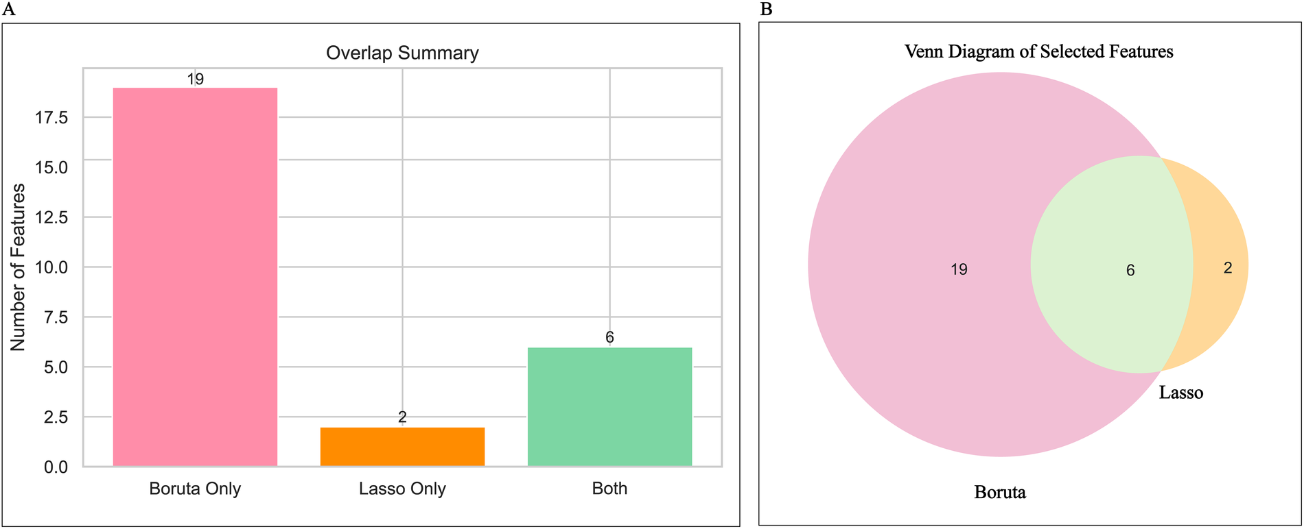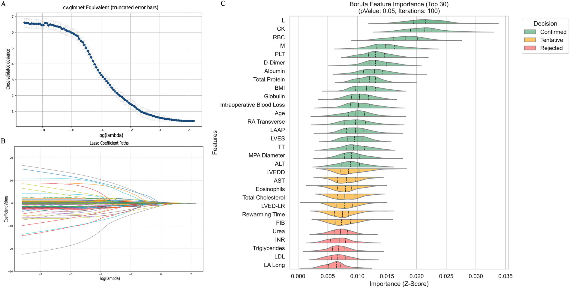 After dataset splitting, categorical and continuous variables were assessed using chi-square and t-tests, respectively, to evaluate the balance between training and testing sets. Most variables showed no significant differences (P > 0.05), with the exception of intraoperative blood loss (P < 0.05). Detailed test results are provided in Table 2. Given the observed associations and correlations among features—as indicated by clustering, independence testing, and Pearson correlation heatmaps—feature selection was performed using both Lasso regression (with L1 regularization; Figures 3A,B) and the Boruta algorithm (Figure 3C). The intersection of features identified by both methods was retained (Figure 4). The final selected features were: Age, absolute monocyte count, right atrial transverse diameter, intraoperative blood loss, platelet count, main pulmonary artery diameter.