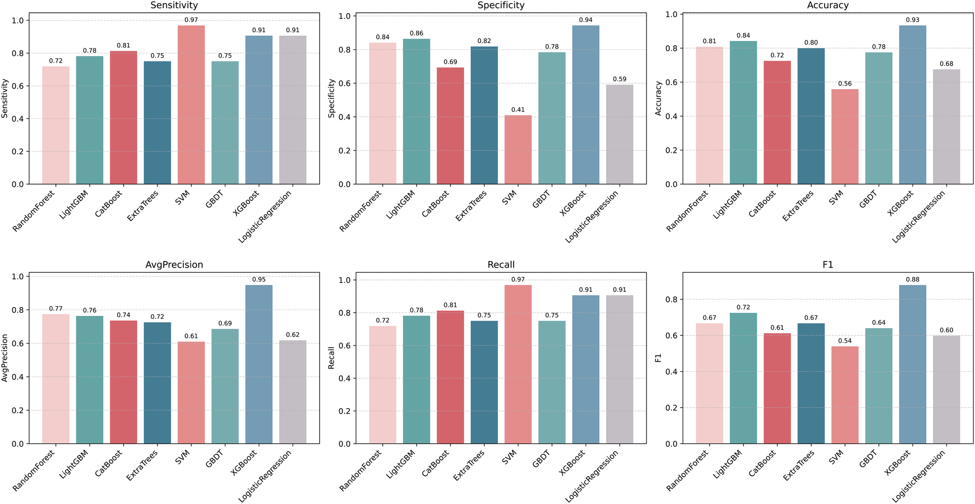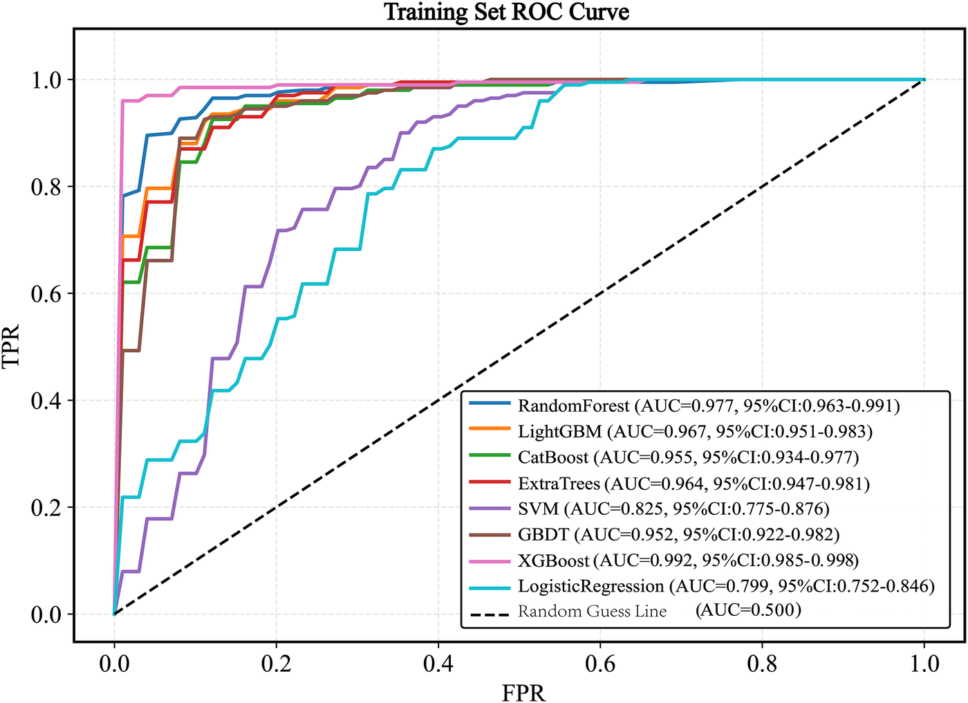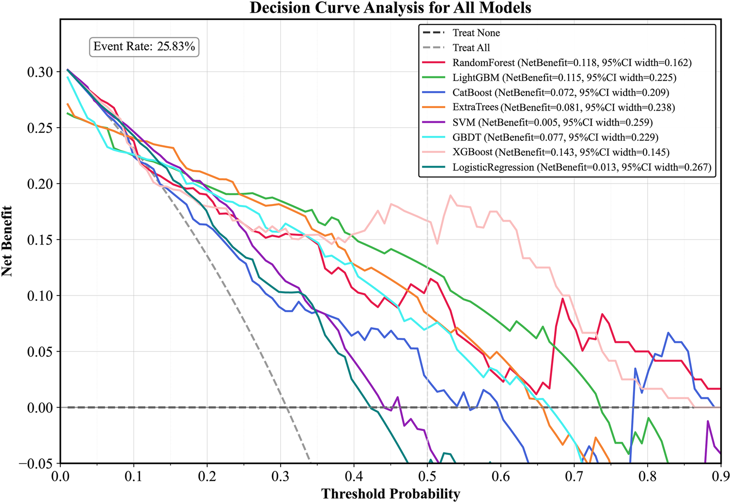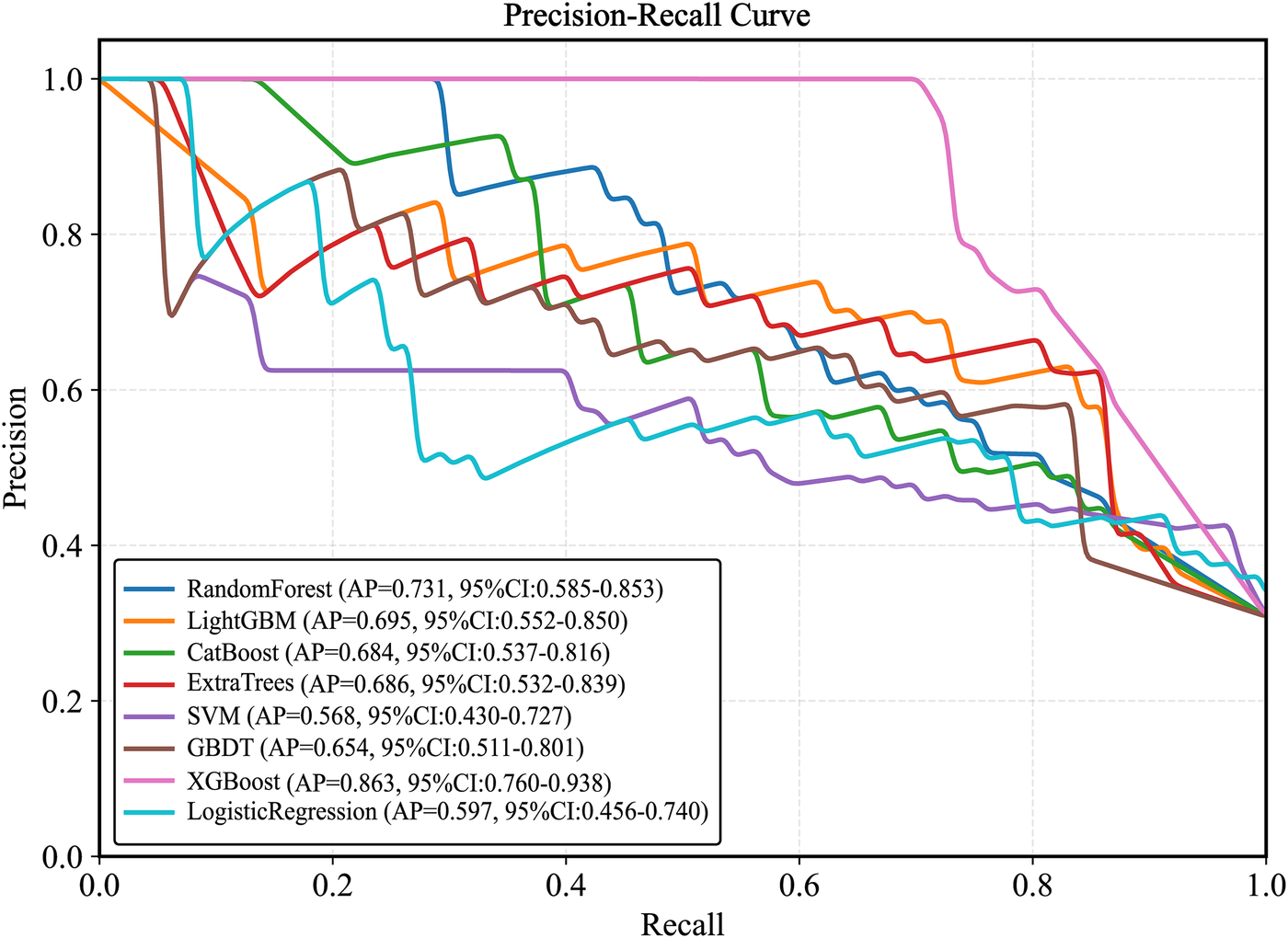 The optimal model was validated on the test set. Performance was assessed using receiver operating characteristic (ROC) and precision-recall (PR) curves, along with sensitivity, specificity, accuracy, average precision, recall, and F1 score. Decision curve analysis (DCA) was performed to evaluate clinical utility. Model calibration was assessed using the Hosmer–Lemeshow (HL) test and calibration curves (CC). The SHAP (SHapley Additive exPlanations) framework was employed to interpret feature contributions and visualize results.