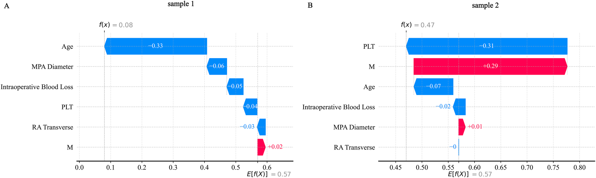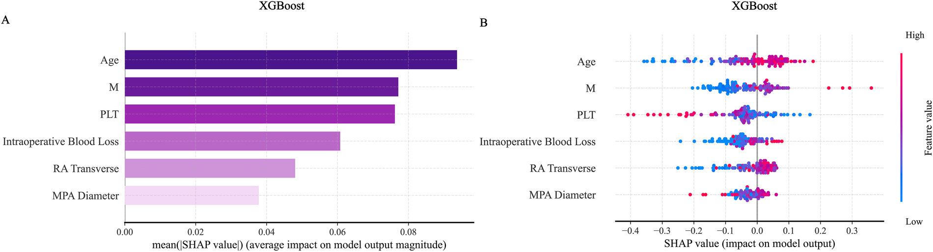 Feature clustering display. (A) Shows the feature clustering tree diagram; (B) Shows the feature clustering heat map. MPA Diameter: Main pulmonary artery diameter; LDH, lactate dehydrogenase; RVOT, right ventricular outflow tract; RVAP, right ventricular anteroposterior diameter; RV Transverse, right ventricular transverse diameter; RA Transverse, right atrial transverse dimension; RA Long, right atrial long axis; PT, prothrombin time; INR, international standardized ratio; TT, thrombin time; APTT, activated partial thromboplastin time; LA Transverse, left atrial transverse dimension; LA Long, left atrial long axis; LAAP, left atrial anterior-posterior diameter; AF, atrial fibrillation; total time, total duration of surgery; HB, hemoglobin; CK, creatine kinase; ALT, alanine aminotransferase; AST, aspartate aminotransferase; MI, myocardial infarction; CHD, coronary atherosclerotic disease; DR Patchy Exudative, x-ray chest radiograph showing patchy exudates; DR Inflammatory Changes, Inflammatory changes on chest x-ray; FIB, fibrinogen; PLT, platelet; FS, Left ventricular shortening fraction; LVEF, left ventricular ejection fraction; BMI, body mass index; LDL, low-density lipoprotein; HDL, how-density lipoprotein; M, absolute monocyte count; N, absolute neutrophil count; L, absolute lymphocyte count; LVES, left ventricular end systole; LVED, left ventricular end-diastolic length; RV Long, right ventricular long axis; AV Annulus, aortic annulus diameter; LVED-LR, left ventricular end-diastolic diameter; LVEDD, left ventricular end-diastolic diameter; LVES-LR, left ventricular end-systolic diameter; LVESD, left ventricular end-systolic anteroposterior diameter.