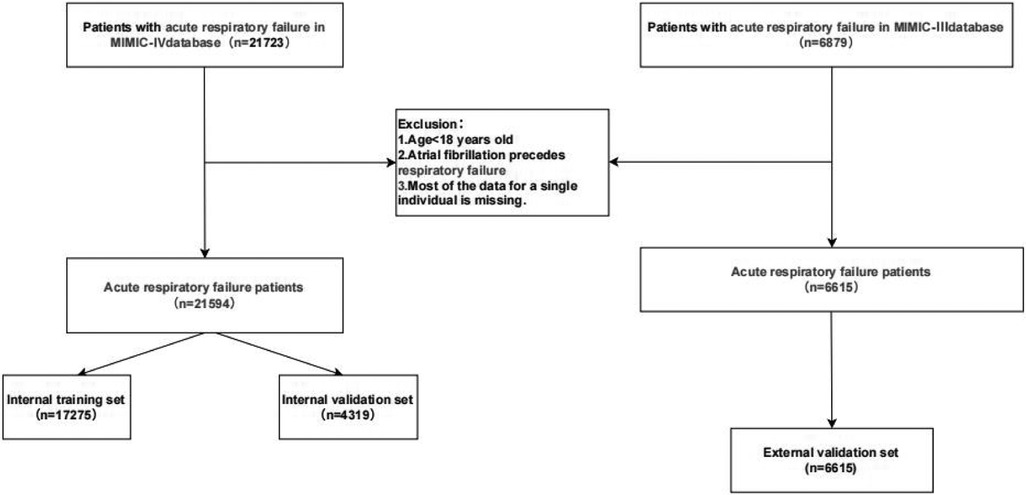 This retrospective observational study extracted data from patients diagnosed with acute respiratory failure (ARF) using the MIMIC-IV (version3.1) and MIMIC-III (version1.4) databases. At present, there are no international guidelines for diagnosing respiratory failure. However, as mentioned earlier, the diagnosis of respiratory failure and atrial fibrillation (AF) is widely recognized. The main purpose of this study is to rule out the diagnosis of respiratory failure before AF, thereby laying the foundation for further research.