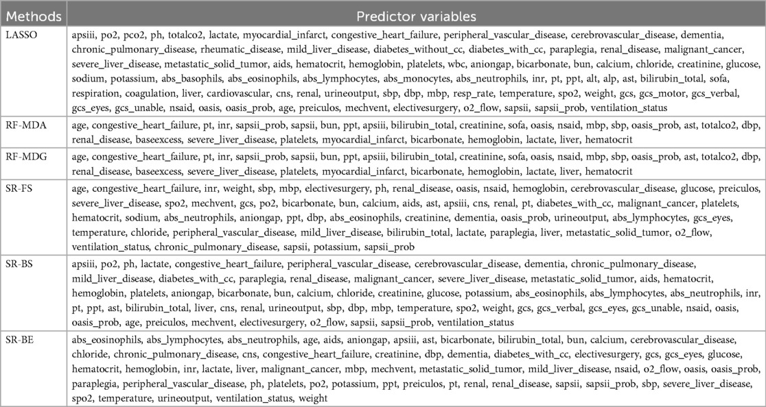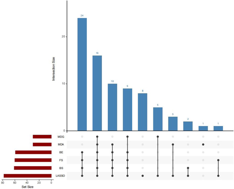 The predictor variables selected by six methods are. The specific parameters of the six methods, namely LASSO, RF-MDA, RF-MDG, SR-FS, SR-BS and SR-BE, are detailed in Supplementary Tables 3–7, Supplementary Figures 3–12. Figure 2 shows the intersection of six groups of predictor variables. Select the features that appear in at least four of the six methods as the final predictor variables.