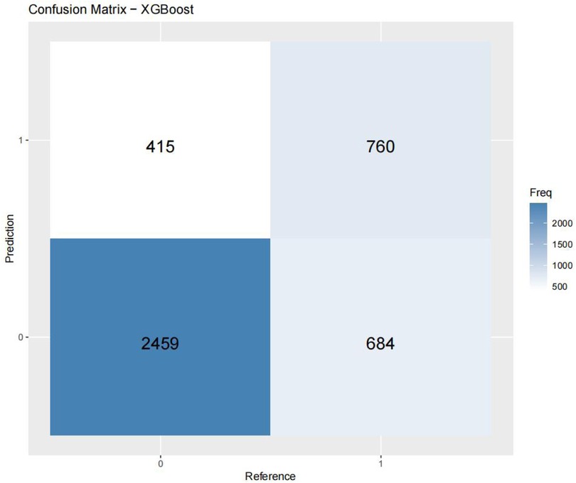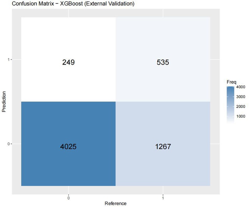 Figures 3–6 displays the confusion matrices for the internal validation set and external validation set of the two optimal models (XGBOOST and RF).
