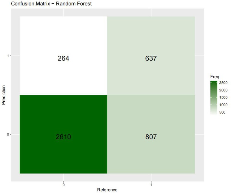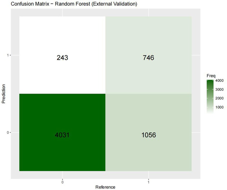 For the internal validation set, the RF metric is: Sensitivity (SEN) 0.673[0.648–0.697], specificity (SPE) 0.786[0.771–0.810], positive likelihood ratio (PLR) 3.148[3.040–3.256], negative likelihood ratio (NLR) 0.416[0.378–0.450] The positive predictive value (PPV) was 0.611[0.596–0.646], the negative predictive value (NPV) was 0.828 [0.813–0.842], and the f1 score was 0.633. For the external validation set, the metrics of the RF model are: SEN = 0.748 [0.728–0.766], SPE = 0.741 [0.727–0.754], PLR = 2.889 [2.718–3.057], NLR = 0.341 [0.315–0.368] PPV = 0.549 [0.529–0.569], NPV = 0.874 [0.864–0.884], F1-Score = 0.63.