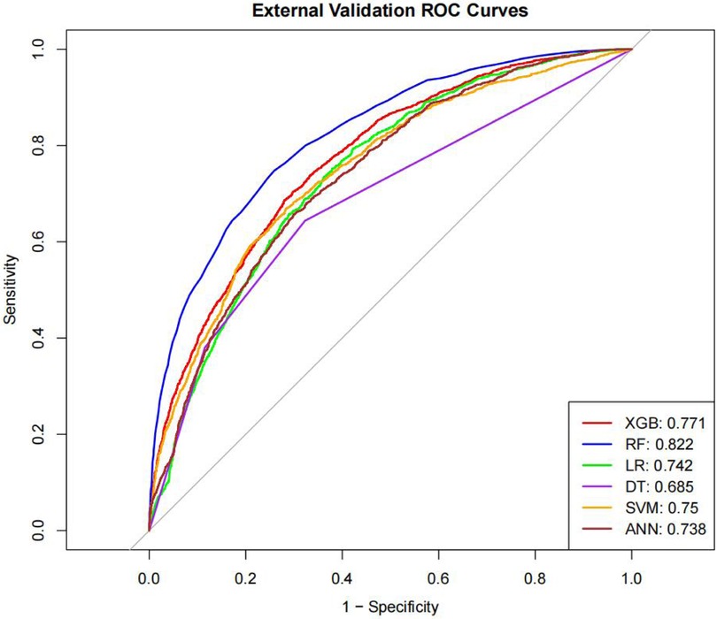 Interestingly, the predictive performance of our machine learning models was slightly higher in the external validation cohort compared with the internal validation cohort. This finding may reflect differences in the distribution of patient characteristics between datasets, or suggest that the models are robust and generalizable across independent patient populations. Nevertheless, careful interpretation is warranted, and further prospective validation is needed to confirm model stability and clinical applicability. Given the large sample size of this study, the likelihood of model overfitting is relatively low. Large-scale datasets can adequately reflect the variability and representativeness of the underlying population, enabling machine learning algorithms to capture true patterns rather than noise. Nevertheless, external validation remains crucial for confirming the model's robustness and generalization capabilities.