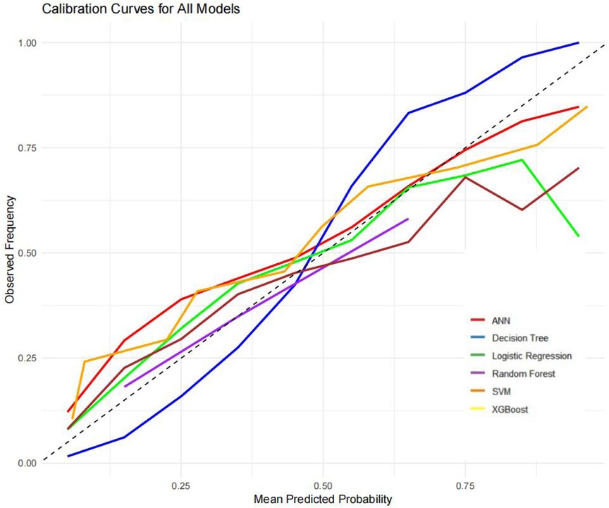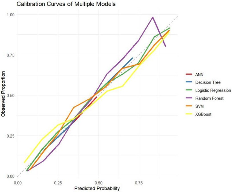 The ROC curves, correction curves and DCA curves of the six models in the internal validation set and the external validation set are shown in Figures 7–12.