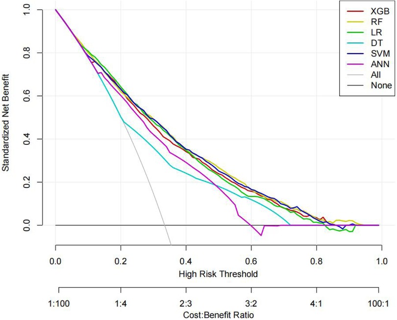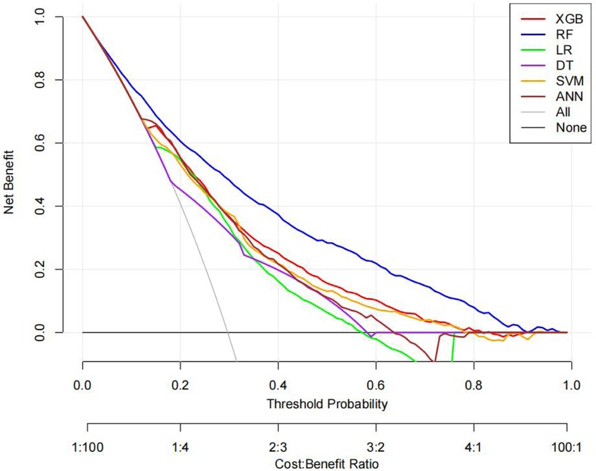 The superior performance of XGBoost and Random Forest (RF) models can be attributed to several factors. Firstly, the AUC values of both models are relatively high (XGBoost: 0.816, RF: 0.831), indicating that the classification capabilities of the two models are strong and they have a good ability to distinguish between atrial fibrillation and non-atrial fibrillation patients. Secondly, their calibration curves are closely aligned with the ideal diagonal, indicating a more accurate probability estimation compared to other models. Finally, the two models demonstrated higher net benefits in the decision curve analysis (DCA) within the threshold probability range, indicating that they have greater clinical utility in guiding decision-making. These advantages highlight the accuracy, reliability and practical value of XGBoost and RF in predicting atrial fibrillation in patients with acute respiratory failure.