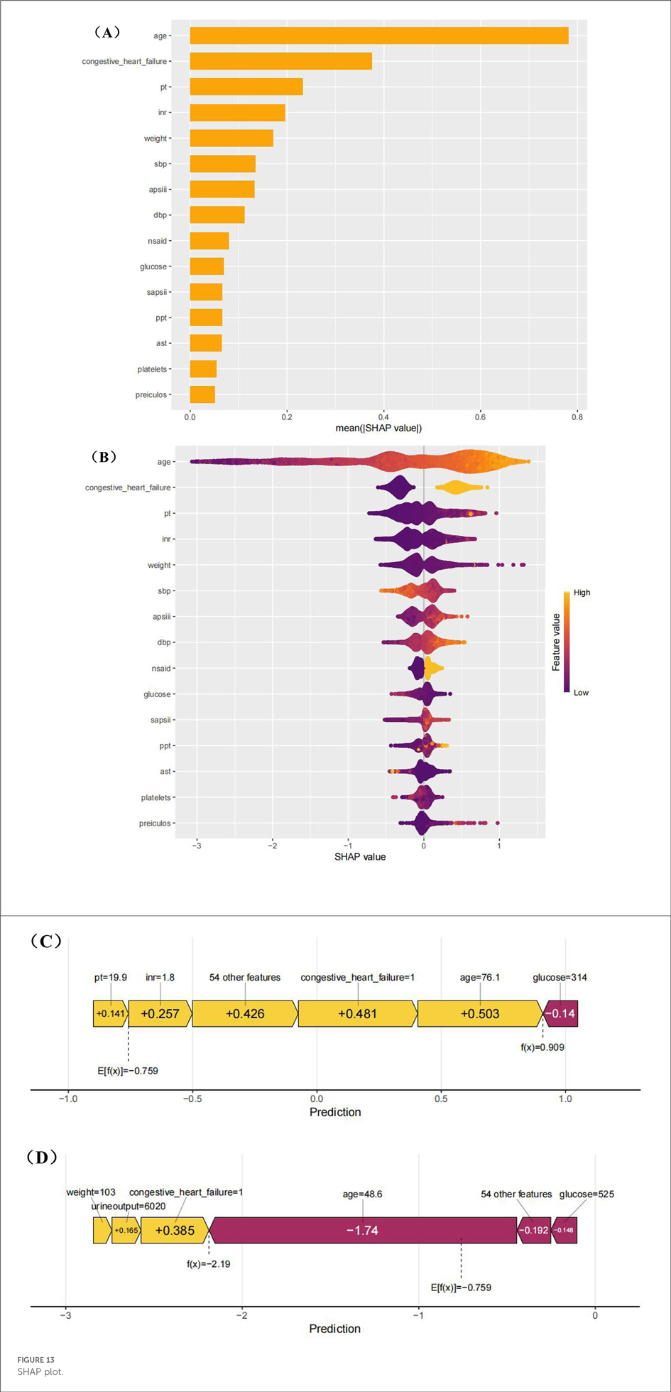 To better understand the influence of different variables on atrial fibrillation, we used the SHapley Additive explanation diagram (Figure 13). As shown in Figures 8A,B, age is the most important factor influencing the development of atrial fibrillation. Figure 13B also highlights the intensity and direction of the influence of each variable. For the convenience of local interpretation, Figures 8C,D show how specific variables increase or decrease the risk of atrial fibrillation.