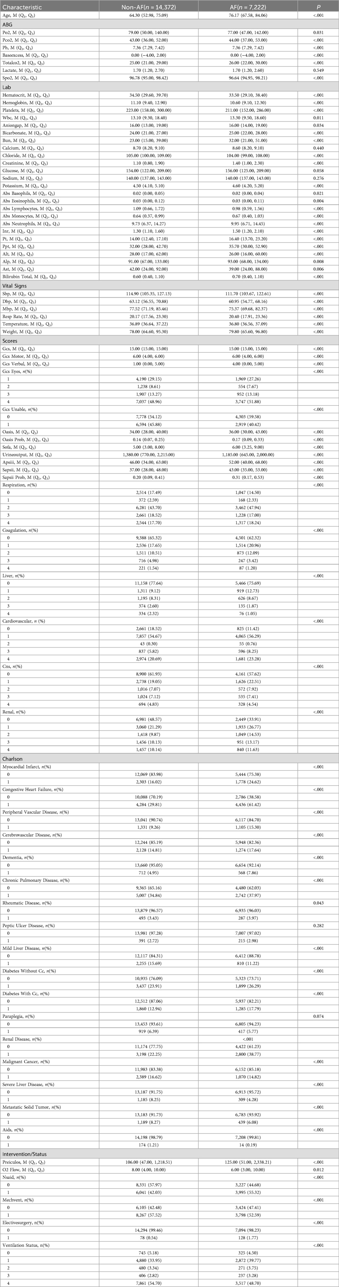 Patients in the MIMIC-IV database were divided into two groups based on the presence of atrial fibrillation. Tables 1, 2 presents a comparison of baseline characteristics between the atrial fibrillation group and the non-atrial fibrillation group.