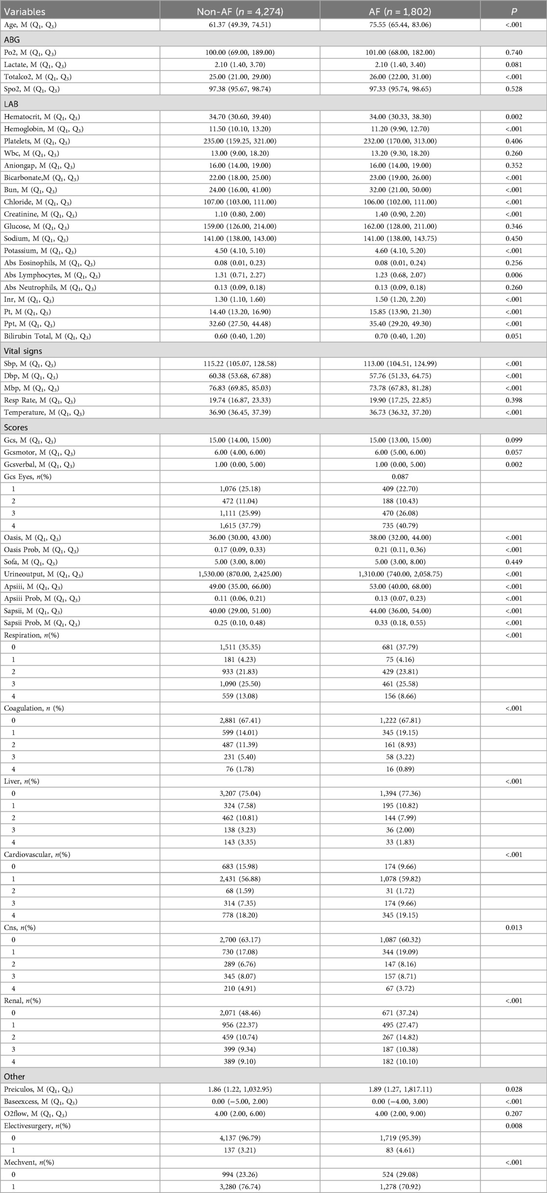 Some clinical and laboratory indicators of patients with atrial fibrillation are significantly higher than those of non-atrial fibrillation patients, including age, pCO₂, pH, alkali excess, TCO₂, SpO₂, Hct, Hgb, PLT, WBC, AG, HCO3, BUN, Cl, Cr, K, absolute basophils and absolute eosinophils. In addition, variables such as different blood cell counts, coagulation indicators, liver function tests, vital signs, GCS, OASIS, SOFA, APS III, SAPS III, Charlson comorbidity index, and Preiculos score were also recorded. As well as therapeutic factors such as oxygen flow rate, the use of non-steroidal anti-inflammatory drugs, mechanical ventilation and elective surgery.