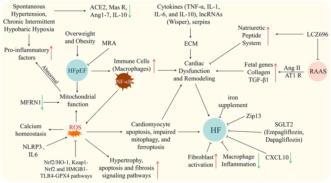Figure 1. Schematic showing mechanisms and therapies in HF/HFpEF: triggers (hypertension, hypoxia, obesity), pathways (inflammation, ROS, RAAS, cytokines), cellular events, and interventions. Arrows: ↑ upregulation, ↓ downregulation, black for causal relationships, ⊥ for inhibition.