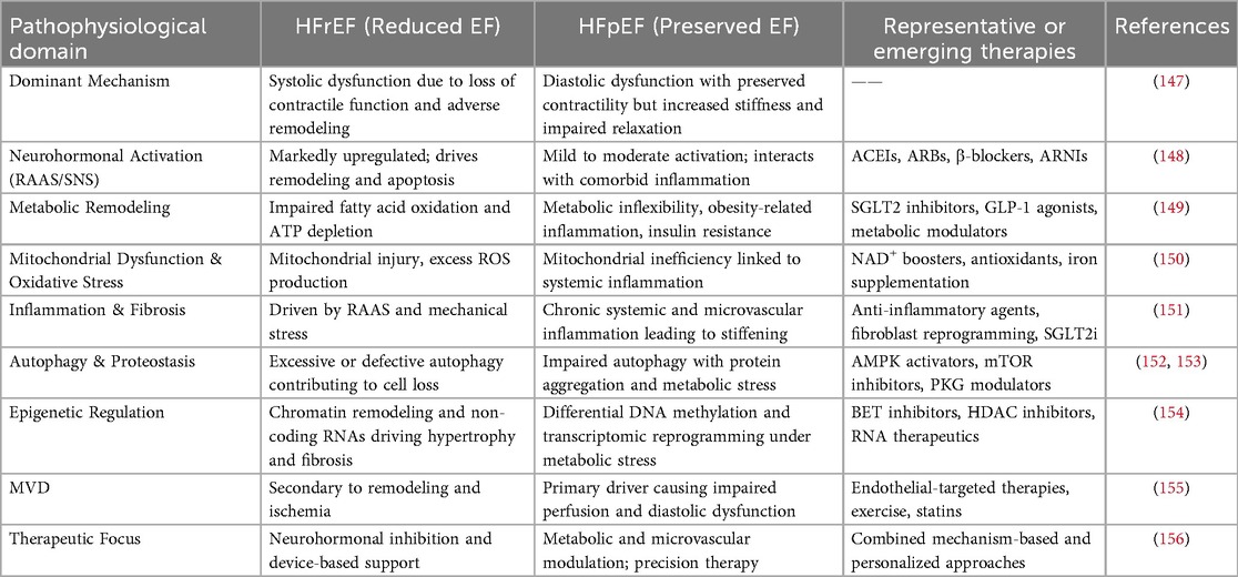 Despite significant progress in pharmacological and device-based therapies, the overall prognosis of HF remains poor, with high rates of hospitalization and mortality (5). While neurohormonal inhibition with ACE inhibitors, β-blockers, and mineralocorticoid receptor antagonists has greatly improved outcomes in HFrEF, similar success has not been achieved in HFpEF (6). No current treatment convincingly reduces mortality in HFpEF, largely because of its heterogeneous mechanisms involving metabolic abnormalities, inflammation, microvascular dysfunction (MVD), and systemic comorbidities (7). These limitations highlight an urgent unmet clinical need for new, mechanism-based and precision-oriented therapeutic strategies.