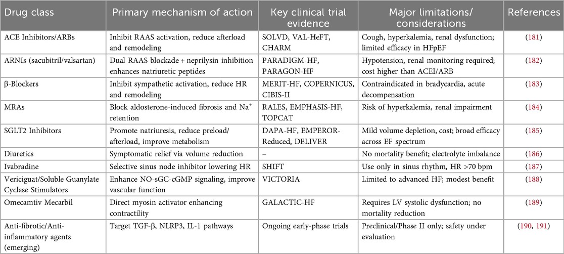 Evidence-based pharmacotherapy for HFrEF includes ACE inhibitors (ACEIs), angiotensin II receptor blockers (ARBs), β-adrenergic blockers, and MRAs. ACEIs and ARBs improve cardiovascular and renal outcomes by suppressing RAAS activity, whereas β-blockers attenuate β1-adrenergic overstimulation, reducing apoptosis, inflammation, and adverse remodeling; their effects on myocyte enhancer factor 2 (MEF2) signaling and downstream gene networks further contribute to improved left ventricular function and survival (163–165). A comprehensive overview of the mechanisms, clinical evidence, and limitations of these pharmacological strategies is provided in Table 2. Combination therapy strategies, such as ACEI/ARB plus β-blocker and MRA, or the use of ARNIs, which simultaneously block RAAS and enhance natriuretic peptide (NP) signaling, have demonstrated significant reductions in cardiovascular mortality and HF hospitalization, with favorable tolerability in clinical practice (166–170). Nevertheless, real-world utilization of these guideline-directed therapies remains suboptimal, and polypharmacy may increase the risk of renal impairment and hyperkalemia, underscoring the need for individualized dosing and combination strategies (171, 172).