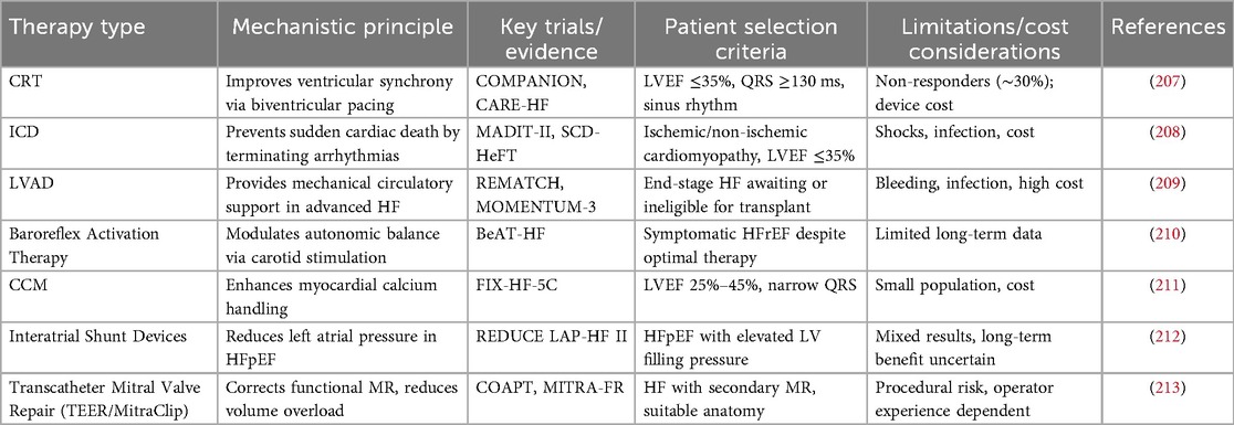 HF patients continue to experience substantial residual risk despite guideline-directed medical therapy, including persistent symptoms, high rates of hospitalization, and mortality (192–194). These limitations have driven the rapid development of device-based interventions, which provide individualized therapies according to HF phenotype and severity. Key device therapies include cardiac resynchronization therapy (CRT), implantable cardioverter-defibrillators (ICD), mechanical circulatory support (MCS), and heart transplantation. An overview of these device-based and interventional approaches, including their indications, underlying mechanisms, and clinical limitations, is summarized in Table 3. CRT improves ventricular mechanical synchrony, enhancing left ventricular systolic function, reducing mitral regurgitation, promoting reverse remodeling, improving NYHA functional class and exercise capacity, and decreasing hospitalization and mortality (195–197). ICDs are primarily indicated for patients with moderate to severe HF or those at high risk, effectively preventing sudden cardiac death and ventricular arrhythmias, with outcomes influenced by NYHA class and cardiac function (198). For end-stage HF, MCS and heart transplantation provide definitive interventions, improving survival and quality of life, although device-related complications and limited availability remain challenges.