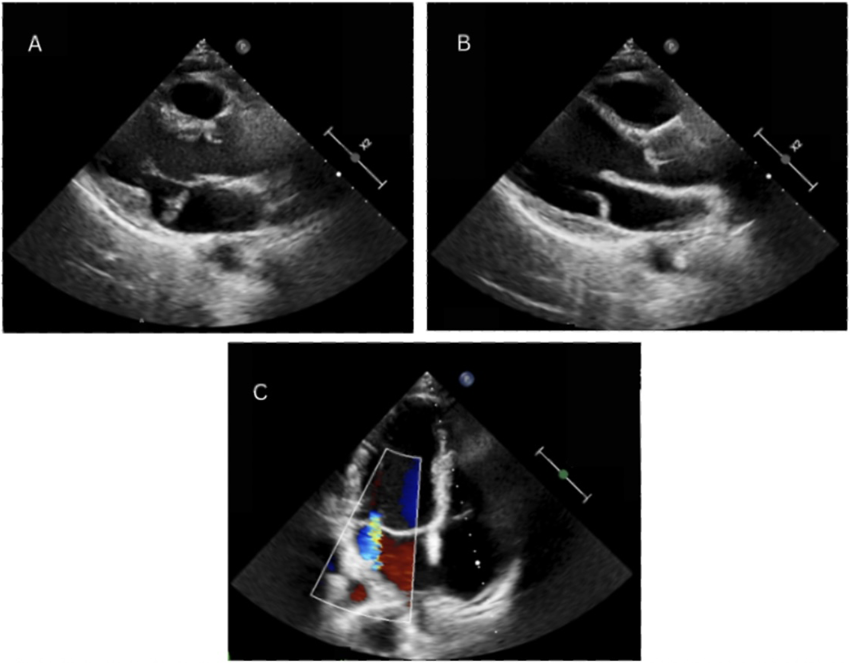 Echocardiography demonstrating mitral annular disjunction. Parasternal long-axis view obtained at end-systole and diastole, showing the separation between the posterior mitral valve leaflet insertion point and the left ventricular myocardium (A,B). Color Doppler imaging visualizing mitral regurgitation, evidenced by a central regurgitant jet (C).