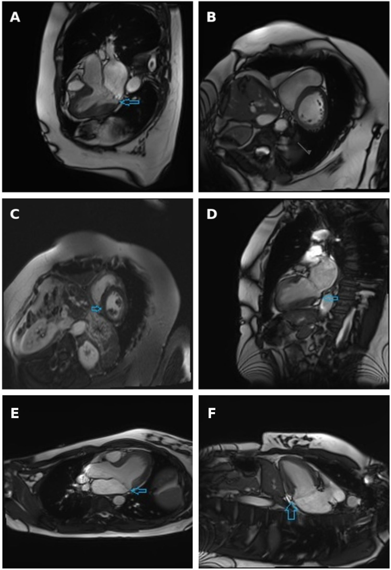Cine three-chamber long-axis view (A), short-axis view at basal segments level (B) and two-chamber view (D) obtained at systole, with arrows indicating the separation between the posterior mitral valve leaflet insertion and the left ventricular myocardium. Late gadolinium enhancement short-axis view: arrow indicates non-specific fibrosis at the inferior right ventricular insertion point (C) Cardiac magnetic resonance imaging demonstrating mitral annular disjunction. Three-chamber long-axis view and (E) two-chamber view (F) obtained at end-systole, with arrows indicating the separation between the posterior mitral valve leaflet insertion point and the left ventricular myocardium.