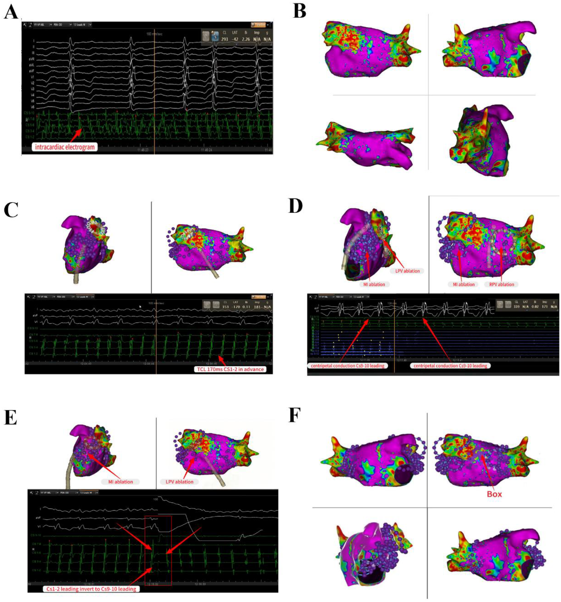 Figure 1. PFA for pulmonary vein isolation and linear ablation in the left atrial intracardiac electrocardiogram shows AF. Left atrial substrate mapping while the AF remained ongoing (A,B). Successful completion of PV potential isolation and mitral isthmus line ablation, AF was converted into atrial flutter with a cycle length of 170 ms and demonstrated eccentric conduction with early CS1-2 polar atrial waves (C). Reinforcing linear ablation of the mitral isthmus, the atrial flutter presented a cycle length of 210 ms and exhibited eccentric conduction marked by early CS9-10 polar atrial waves (D,E). Perform BOX ablation on the posterior wall of the left atrial (F). AF, atrial fibrillation; PV, pulmonary vein.