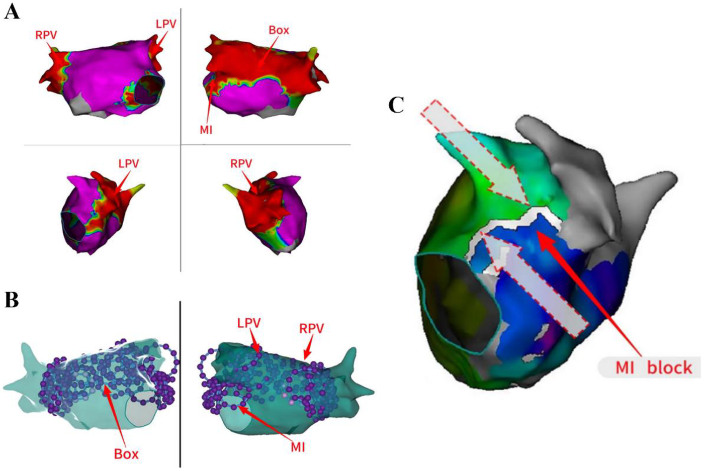 Figure 2. The ablation lines in the PVVs and MI were appeared distinct. The ablation line within the pulmonary vein antrum and mitral isthmus vestibule appeared distinct (A–C). MI, mitral isthmus; LPV, Left pulmonary vein; RPV, right pulmonary vein.