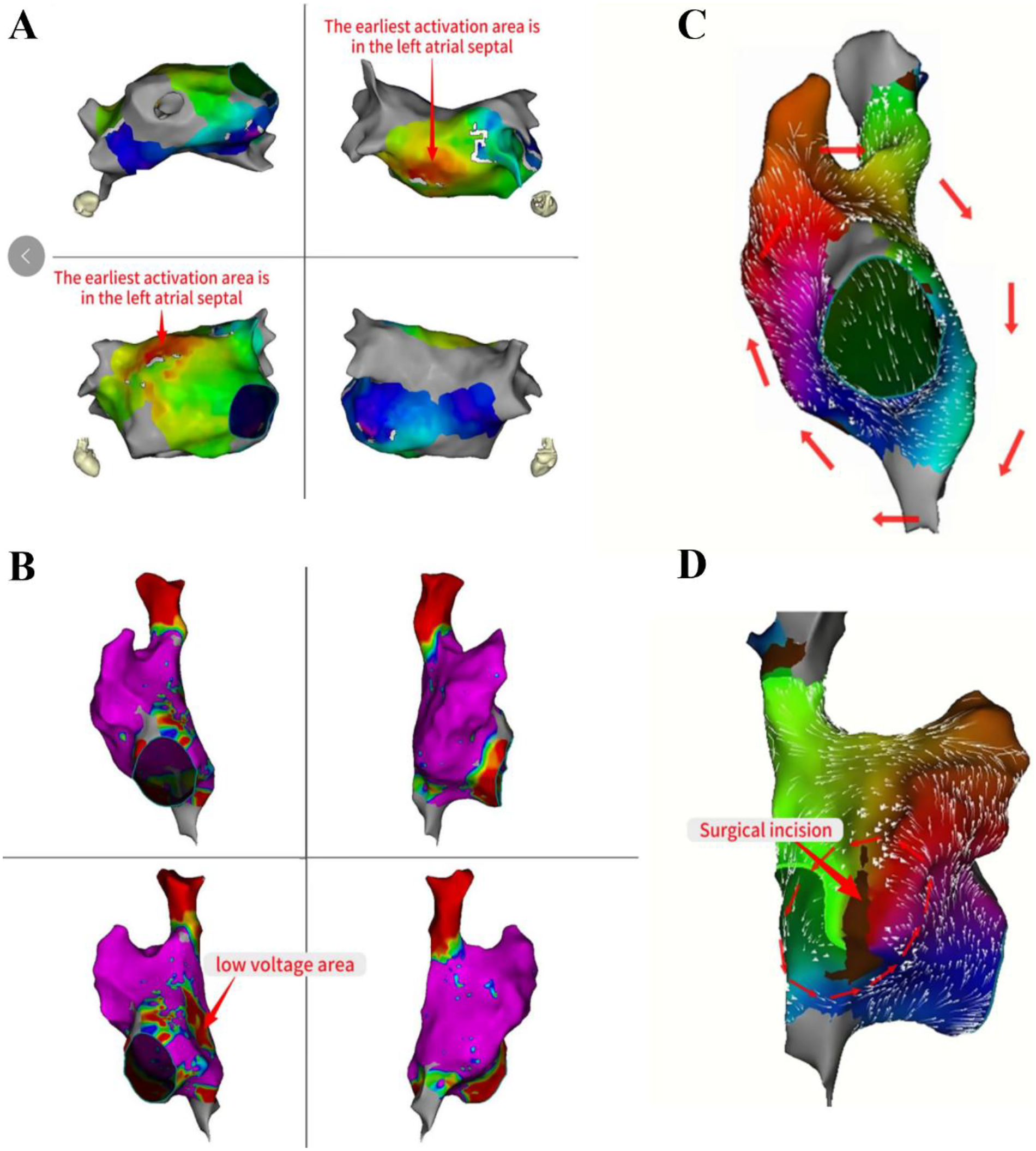 Figure 3. Mapping of left atrial activation patterns and right atrial dual reentrant circuits. The propagation pattern in the left atrial revealed that the atrial septum was excited earlier (A). The right atrial substrate mapping clearly showed a low-voltage area in the right atrial (B). The activation mapping revealed the two reentrant loops in the right atrial, one traveled around the tricuspid annulus, and the other around the surgical incision (C,D).